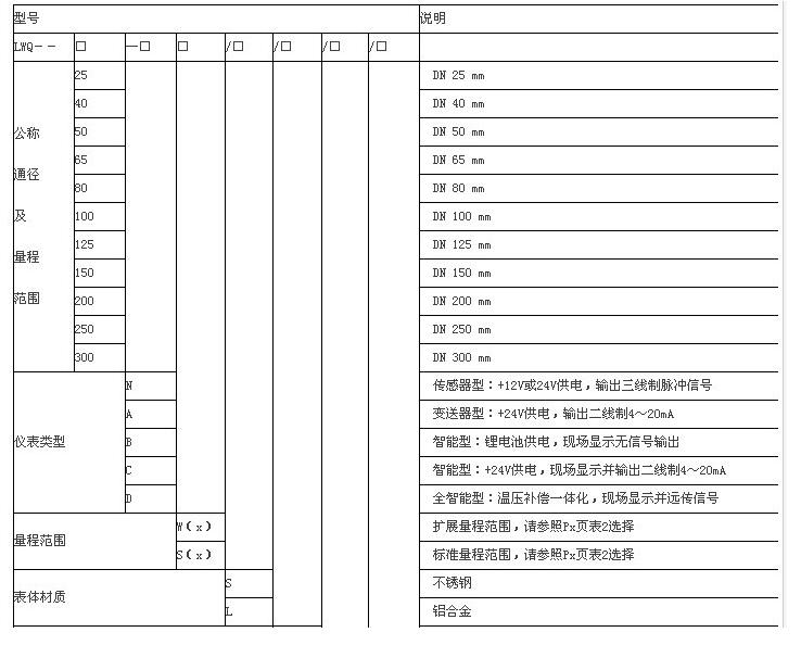 用戶在選型時(shí),應(yīng)根據(jù)管道公稱壓力、介質(zhì)較高壓力、介質(zhì)溫度、介質(zhì)組分情況、流量范圍及信號(hào)輸出要求合理選擇流量計(jì)的型號(hào)規(guī)格。